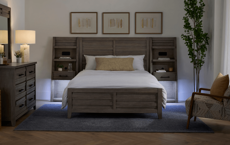 Rich wood frames, upholstered headboards, velvet benches, floating nightstands — everything coordinated like a designer planned it for you.